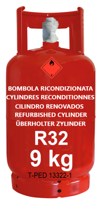 Cylinder refillable that is T-PED / EN 13322-1 certified RECONDITIONED R32 9-kg. Created as an alternative to R410A gas. Used by major air conditioner manufacturers. Low environmental impact UN 3252. Valve 21.7″ x 1/14 LEFT